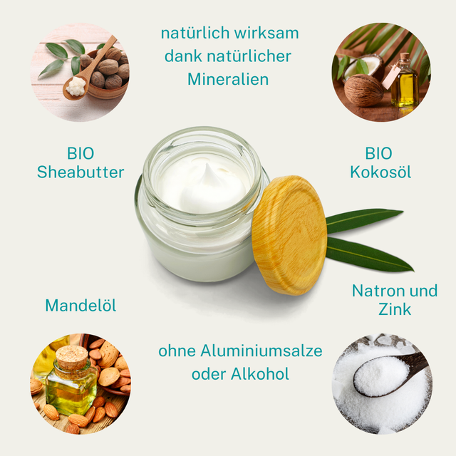 Deze deo bevat zuiveringszout en zink en deze twee remmen de bacteriën af. En om je okselhuid te verzorgen en beschermen, kun je rekenen op de aanwezigheid van biologische sheaboter, amandelolie en biologische kokosolie.